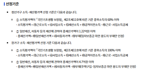 여기서 끝이 아니라 부모를 포함한 ‘원가구’ 기준도 함께 심사됩니다. 원가구는 소득이 기준 중위소득 100% 이하, 재산은 4억 7천만 원 이하여야 하며, 부모의 경제 상황이 기준을 초과하면 본인이 조건을 충족해도 탈락할 수 있습니다. 즉, 이 제도는 개인이 아닌 가구 전체의 경제 여건을 종합적으로 판단하는 구조입니다.