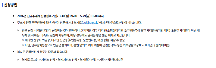 청년월세지원은 정해진 기간 내에 온라인 또는 오프라인 방식으로 신청 가능하며, 절차 자체는 비교적 단순하지만 몇 가지 중요한 포인트를 반드시 확인해야 합니다. 먼저 2026년 신규 신청 접수 기간은 3월 30일(월) 09:00부터 5월 29일(금) 16:00까지로, 해당 기간 내에 신청을 완료해야 심사 대상에 포함됩니다.